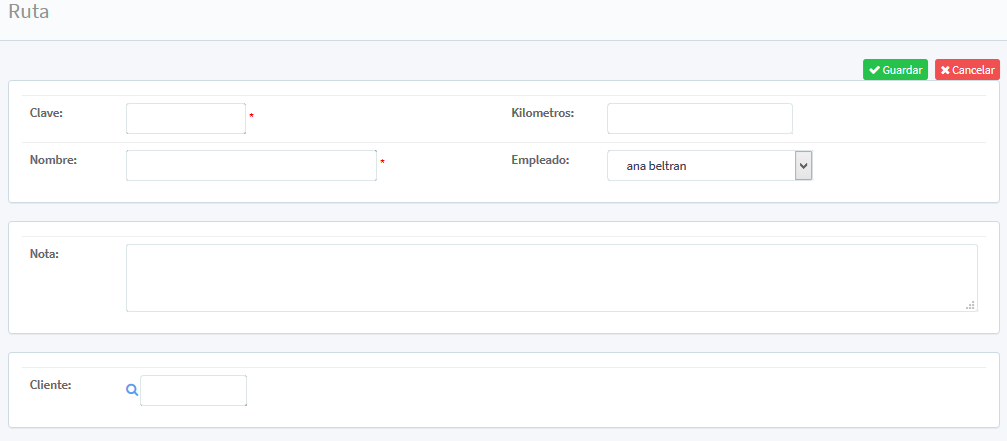 Una vez cargada la información en la parte superior derecha de la pantalla aparecerán los botones Guardar y Cancelar que permitirá guardar o cancelar la información capturada y a la vez regresar a la pantalla inicial de Ruta.