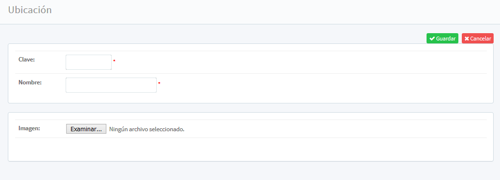 envía a una nueva pantalla con los siguientes datos de registro: Clave (asignar una clave para la ubicación), Nombre (asignar nombre de la ubicación a registrar, Imagen (por medio del botón de examinar se puede cargar el archivo jpg. De imagen que apoye la ubicación de las rutas.