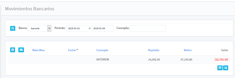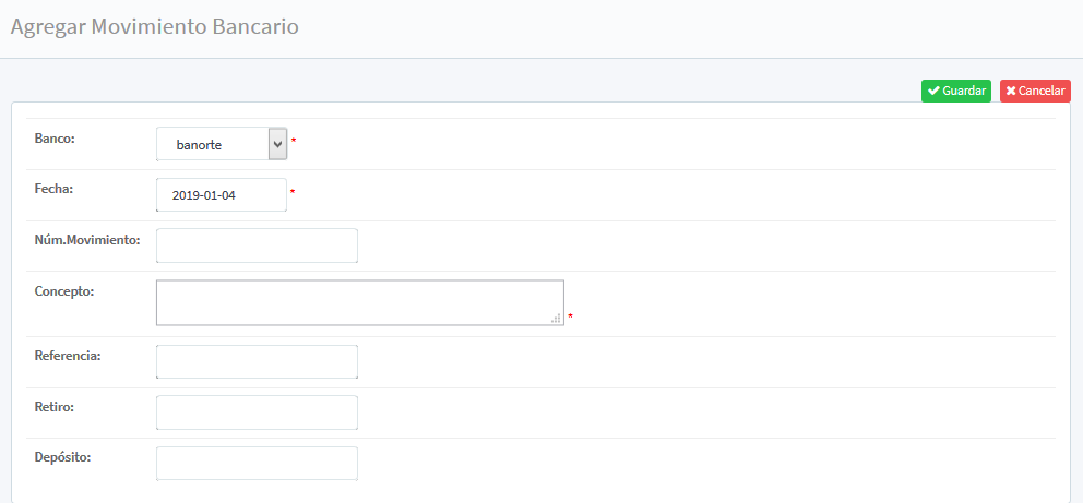 envía a la nueva pantalla de registro, con el menú vertical de registro, se encuentran los siguientes datos: Banco (si el movimiento se encuentra en la cuenta principal), Fecha (seleccionar del calendario la fecha actual del movimiento), Núm. De movimientos, Concepto (dentro del recuadro de manera libre se ingresa el motivo del movimiento), Referencia (Ingresar referencia bancaria), Retiro (ingresar la cantidad en monedas del retiro), y Deposito (en caso de que el movimiento fuera por un deposito a la cuenta, ingresar la cantidad en número).
