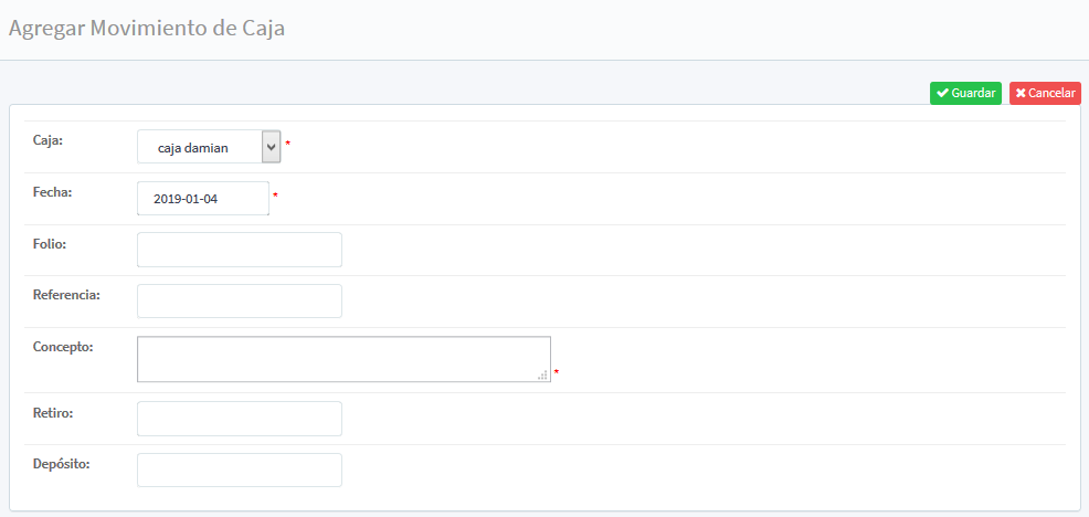 que mostrara nueva pantalla para dar de alta los movimientos, en el menú vertical de datos por llenar se encuentra: Caja (dentro del cuadro de despliegue se selecciona el área donde se encuentra la caja en que se realizó el movimiento, en caso de existir en más de un área), Fecha (seleccionado del calendario la fecha del día actual del registro), Folio (asignar un número de folio para dar secuencia a los registros), Referencia (cualquier dato que dirija la información en caso de búsqueda), Concepto (motivo por el cual se realiza el movimiento en caja, pequeña descripción), Retiro (cantidad numérica y monetaria a retirar de la caja), Deposito (cantidad numérica y monetaria a depositar de la caja).