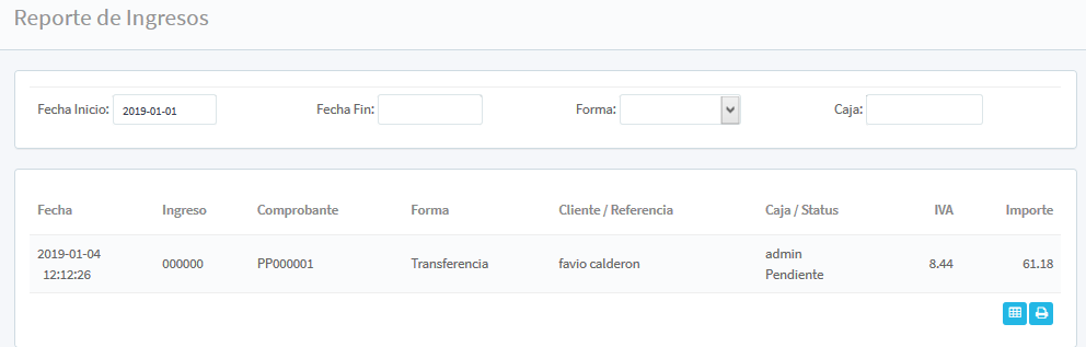 Este apartado permitirá tener un reporte de los totales de ingresos aplicados, clasificados por fechas, los criterios de búsqueda aparecerán Fecha de inicio y Fecha Fin que permitirá establecer el periodo en el que se desea obtener el reporte de ingresos, así como la opción de búsqueda por Forma (indicando el ingreso mediante; Nota de crédito, Vales, Factura, Efectivo, Cheque, TC, TD, etc.) y Caja.
