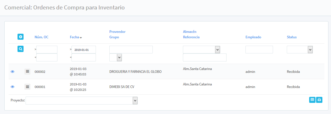 En la pantalla principal de órdenes de compra se lleva la consulta y alta de las órdenes realizadas en la dinámica de la empresa. En el menú horizontal, se puede realizar la búsqueda de alguna orden de compra para consulta; Núm. OC (con dos campos indicando introducir el número de orden a buscar en un rango de mayor a menor), Fecha (con dos cuadros de ingreso para muestra del periodo en que la orden fue realizada), Proveedor / Grupo (realizando la búsqueda del proveedor, o grupo) Referencia /Almacén (como búsqueda de almacén donde fue realizado el movimiento), Empleado (introduciendo del cuadro en blanco el nombre del Empleado que realizo la orden de compra) y Status (desplegando la lista de Pendiente, Aplicada, Cancelada, Recibida, Backorder y Faltante).