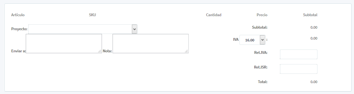 Una vez realizado el primer paso, se modifica la orden de compra con el menú Artículo (realizando la búsqueda con el icono de búsqueda), Cantidad, Precio y Subtotal. Al seleccionar el artículo y la cantidad, al final se selecciona el Proyecto que indica la operación y la suma de todos los productos agregados.