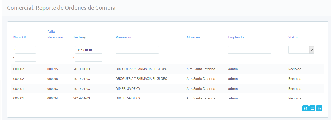 El reporte del listado de las Órdenes de compra se realiza con la búsqueda de los siguientes filtros: Núm. Orden de compra (con un rango de folios de mayor a menor), Folio Recepción, Fecha (indicando el periodo deseado del reporte), Proveedor, Almacén, Empleado y Status (seleccionando de la lista del recuadro la opción de Pendiente, Aplicada, Cancelada, Recibida, Backorder y Faltante según el reporte deseado).