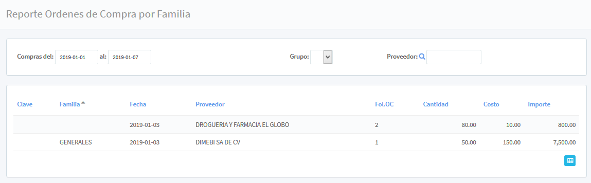 Mismo reporte únicamente clasificado por familia, únicamente ingresando Compras del (indicando el periodo deseado del reporte), Grupo y Proveedor (seleccionando del base de datos los proveedores con el icono de búsqueda).