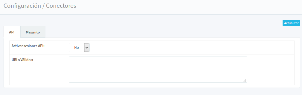 En el menú: API: Activar sesiones API y URL’s Validos (con un cuadro de texto para ingresar dicha información.