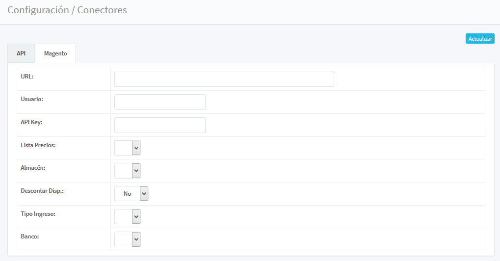 En el menú Magento: URL, Usuario, API Key, Lista Precios, Almacén, Descontar Disp. Tipo Ingreso y Banco.