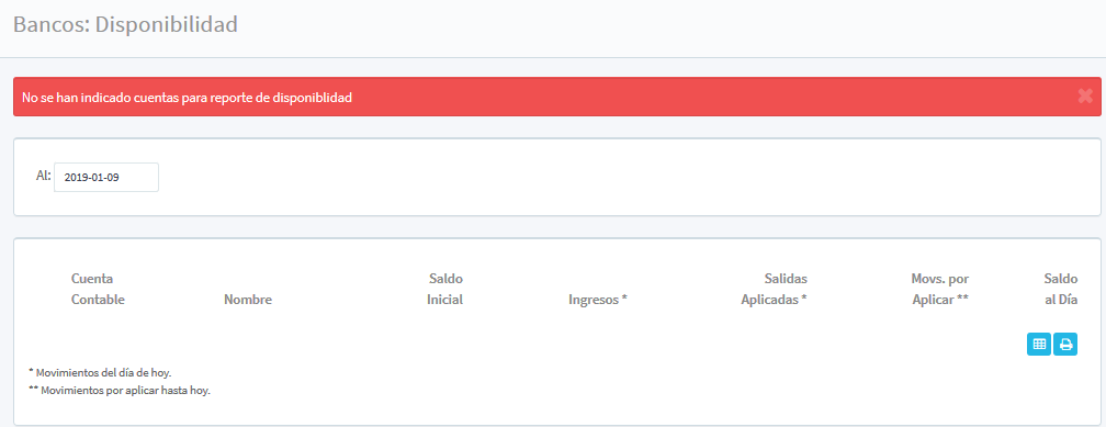 De los Bancos se genera el reporte de las cuentas disponibles, únicamente se ingresa la fecha para el reporte y los datos que nos mostrara como movimientos es: Cuenta contable, nombre, Saldo inicial, Ingresos, Salidas aplicadas, Movimientos por aplicar y Saldo al día.