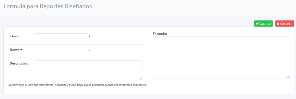 nos enviara a una nueva pantalla para ingresar: Clave (como dato necesario), Nombre (también como dato obligatorio) Descripción (para ingresar información relevante para futuras consultas), Formula.