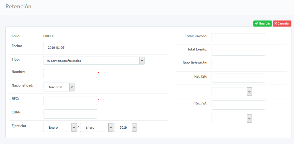 La información a ingresar o modificar es mediante los siguientes conceptos; Folio (se arroja por default en el sistema el folio asignado a la retención), Fecha (del calendario se selección la fecha inicial del registro de la retención) Tipo (dentro de la lista de despliegue se puede seleccionar el tipo de retención que se registrara), Nombre (como dato obligatorio se determina nombre para identificar en futuras consultas), Nacionalidad (de las opciones; Extranjero o nacional), RFC, Curp, Ejercicio (indicando las dos fechas y año del ejercicio), Total Gravado, Total Exento, Base Retención, Ret. ISR y Ret. IVA.
