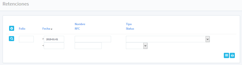 Una vez en la pantalla de inicio se permite realizar la búsqueda de las retenciones agregadas con anterioridad por medio del menú de búsqueda: Folio (que se arroja por default en el sistema el folio asignado a la retención), Fecha (on dos cuadros de ingreso para muestra del periodo en que se desea consultar las retenciones), Nombre/ RFC (con el que se identificó la retención en el registro), Tipo /Status (seleccionando del cuadro de lista el status de; Pendiente, Aplicado y Cancelado)