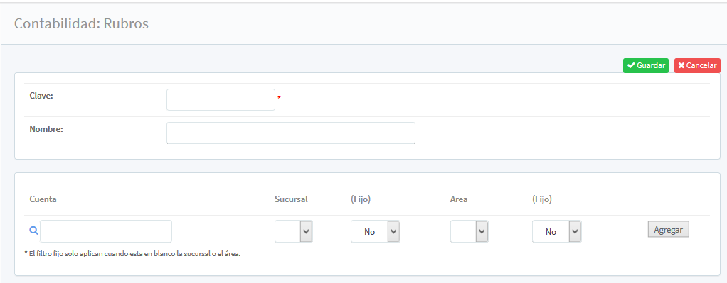 que nos envía a nueva pantalla para el registro de los Rubros de la contabilidad, se ingresa: Clave (como campo obligatorio), Nombre (para asignación e identificación del rubro) y por ultimo con el icono de búsqueda se selecciona la cuenta, con la información de Sucursal, Fijo, Área y Fijo. El botón de agregar enlistara todas las cuentas necesarias en el registro del Rubro.