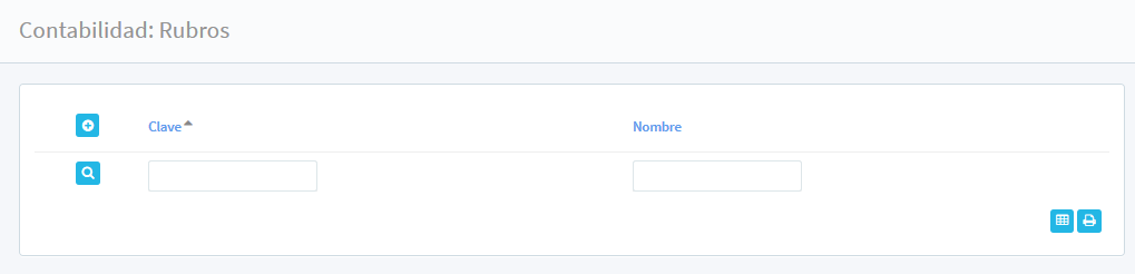 En la pantalla principal, se realiza la búsqueda de los Rubros previamente registrados, Con los filtros: Clave y Nombre. La información desplegada una vez consultada será con los filtros antes mencionados.