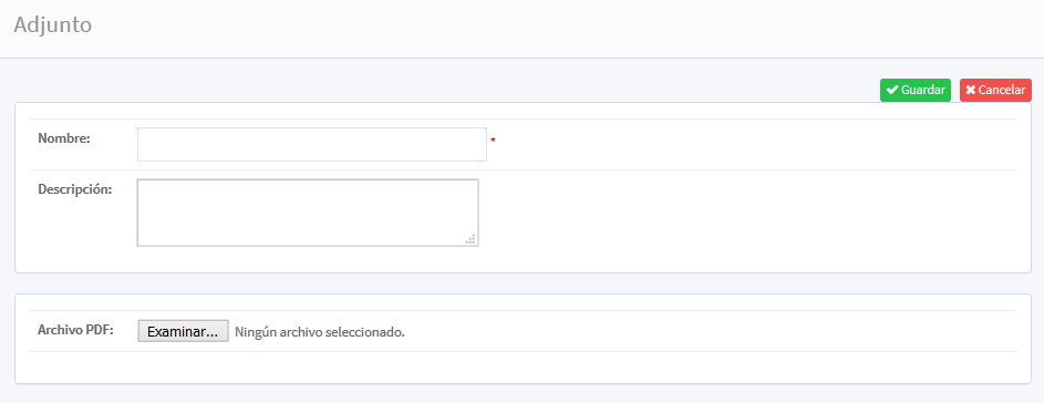 que envía a nueva pantalla donde se podrá ingresar la información del adjunto, asignando un Nombre (como dato obligatorio se asigna un nombre para su posterior búsqueda y consulta), Descripción (en un recuadro en blanco se ingresa una breve descripción para detalles del archivo).