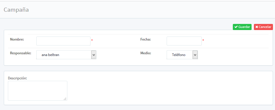 para dar registro a las nuevas campañas programadas, se enviara a una nueva pantalla donde se realiza el registro del Nombre (ingresar en el cuadro de dialogo el nombre que identificara a la nueva campaña), Fecha (dentro del calendario del cuadro de texto se selecciona la fecha en que se desea programar la campaña), Responsable (se asigna a la persona responsable que llevara a cabo la campaña), Medio (se especifica cual será la manera en la que se llevara a cabo la campaña, por medio de; teléfono, e-mail, mensaje, Whatsapp y visita).