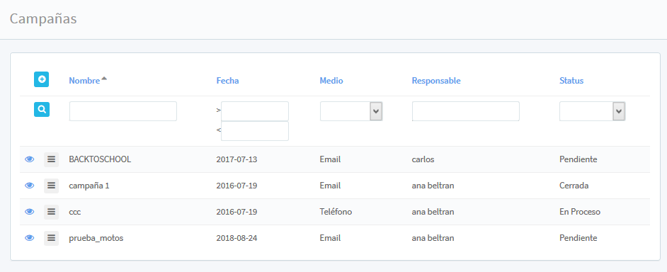 De regreso en la pantalla principal de Campaña se enlista la información con los siguientes filtros de búsqueda; Nombre (para realizar la búsqueda de la campaña por el nombre asignado), Fecha (con dos campos de dialogo para indicar un periodo de inicio y fin de la campaña programada), Medio (se filtraran las campañas según el medio de envío), Responsable (se selecciona de la lista la persona encargada, mostrando todas las campañas asignadas a la persona seleccionada), Status (mostrando la lista de las campañas según su estatus; Pendiente, en proceso, cancelada y cerrada).
