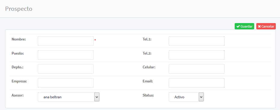 En la nueva pantalla, aparece se deberá de llenar la siguiente información; Nombre (registrando en el cuadro de texto, como como campo obligatorio el nombre del nuevo prospecto), Puesto (en el cuadro de dialogo ingresar el puesto de la persona a registrar), Departamento (para especificar datos laborales más específicos), Empresa, Asesor (se selecciona de la lista del cuadro de dialogo el asesor asignado al cliente en cuestión), Tel. 1, Tel. 2, Celular, Email (como dato necesario dentro del registro de los clientes), Status (dentro de las opciones de la lista del cuadro de dialogo indicando si el cliente esta; activo, suspendido y/o cancelado).