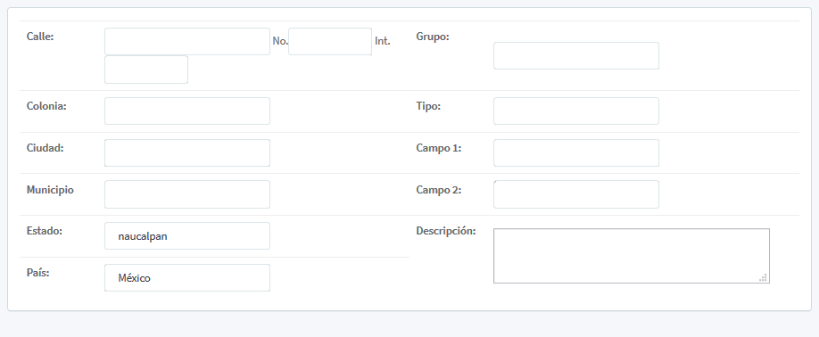 En la segunda parte del registro se llenan los siguientes datos: Calle (con núm. y núm. interior) Colonia, Ciudad, Municipio, Estado, País, así como Grupo, Tipo, Campo 1 y 2. Al final un recuadro para ingresar descripción del cliente para apoyo en futuras consultas.