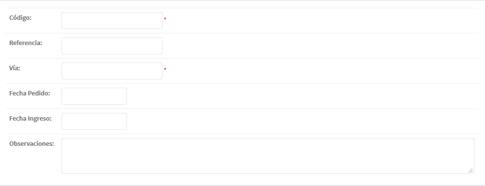 En la segunda parte de la pantalla nos muestra el menú: Código, Referencia, Vía (en la que se aplicó el procedimiento), Fecha Pedido, Fecha de Ingreso y Observaciones.