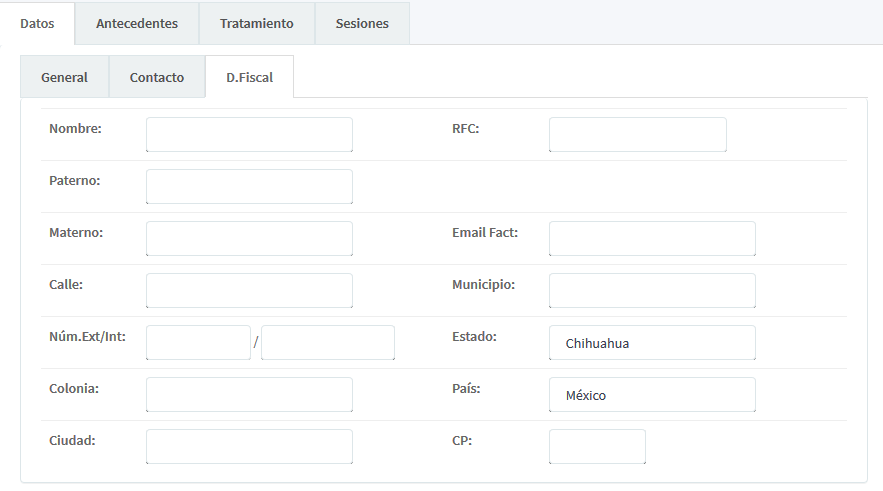 - 1.3 D. Fiscal: Para efectos fiscales en este menú los datos que se deben llenar son los siguientes información fiscal: Nombre Fiscal, así como su apellido aterno y Materno, RFC e Email Fact. (Correo electrónico de contacto para envíos de facturas), Calle, Núm. Exterior, Núm. Interior, Colonia, Ciudad, Municipio, Estado, País y Código Postal.