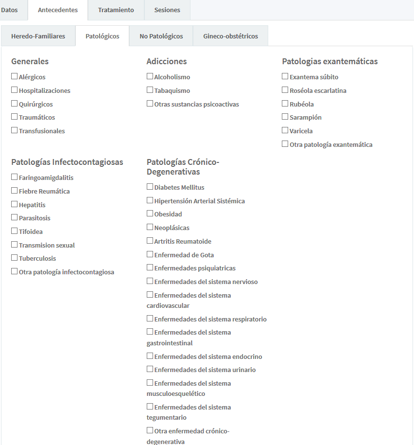 - 2.2 Patológicos: En los antecedentes patológicos a diferencia de la sección anterior los recuadros a seleccionar se muestran de lado izquierdo de la patología que pueda presentar el paciente, clasificándolos por patologías o enfermedades generales.