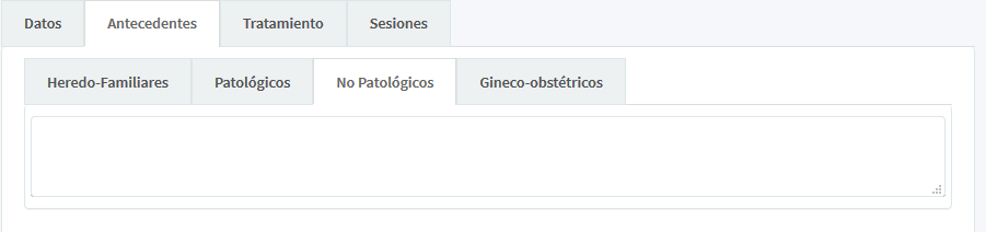 - 2.3 No Patológicos: Si se requiere alguna anotación adicional que sea importante registrar del paciente, en este menú se presenta un recuadro blanco para llevar el registro y seguimiento al paciente.
