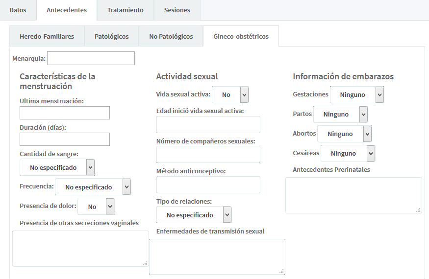 - 2.4 Gineco-obstetricos: Para el registro de antecedentes ginecológicos en relación al cuidado y/o enfermedades se divide en tres secciones; Características de la menstruación (con datos como última menstruación, duración, frecuencia, etc.) Actividad sexual e Información de embarazos, donde por medio de recuadro de texto y/o selección de opciones por medio de la lista precargada se da seguimiento a dicha información.