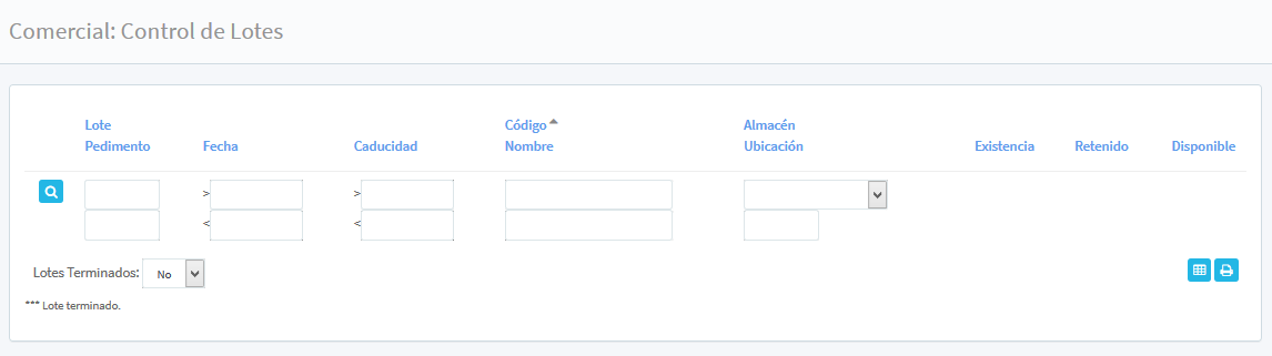 Los lotes del inventario se administran con la lista que se muestra dentro de los filtros de búsqueda; Lote Pedimento (según el lote a consultar), Fecha (con dos campos que permite seleccionar del calendario la Fecha de inicio y/o fecha final, indicando un rango de consulta), Caducidad (con dos rangos de ingreso para la selección dentro del calendario), Código /Nombre, Almacén / Ubicación (seleccionándolo del registro de almacenes), así como Existencia, Retenido y Disponible.