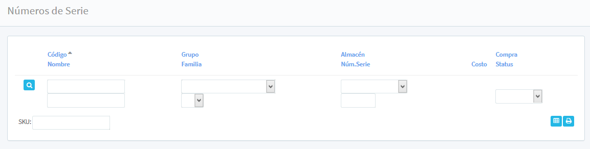 Permite realizar consulta como se menciona del número de serie de los productos del inventario, de una manera simple, se puede buscar el producto por medio de su Código u Nombre, habilitando los dos campos de consulta, así como por medio de Grupo/Familia (con dos campos de consulta con lista de despliegue para seleccionar el grupo o familia deseado y previamente capturados), Almacén /Número de Serie (al que fue asignado el producto y/o el número de serie del producto), Costo /Compra Status (despliega del cuadro la lista con las opciones; Disponible y/o Vendido).