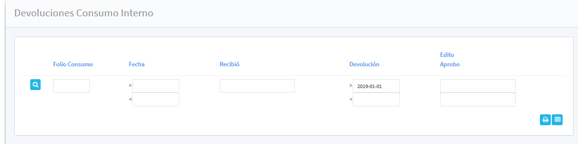 Para la consulta de información de todo lo referente a las devoluciones de Artículos internos, los filtros de búsqueda son: Folio consumo, Fecha (con dos campos de ingreso para especificar dentro del calendario el periodo a consultar), Recibió (persona encargada de la recepción de la devolución, Devolución (con dos campos de ingreso para la selección en el calendario) y Edito /Aprobó (persona encargada y(o responsable del movimiento).