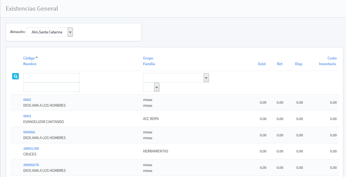 De inicio se selecciona el Almacén que se desea consultar y se enlista de manera general con la siguiente información, además de filtro de búsqueda; Código/Nombre (para búsqueda por nombre de producto), Grupo/ Familia (para una consulta más específica con estas dos opciones se tendrán dos cuadros en forma de lista para seleccionar el Grupo al que pertenece familia previamente asignadas), además de desglosar las Existencias, Ret. Disponibles y Costo Inventario de cada una de las existencias.