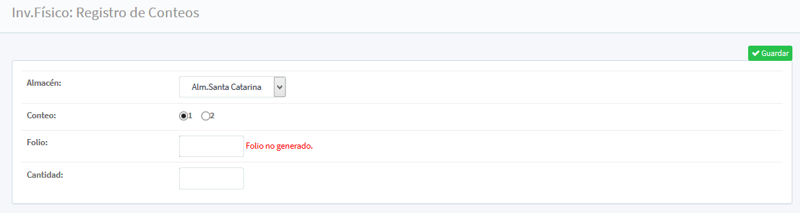 En esta modulo se realiza la captura de los conteos del inventario físico El menú que despliega; Almacén (seleccionándolo del cuadro de lista), Conteo, Folio y Cantidad