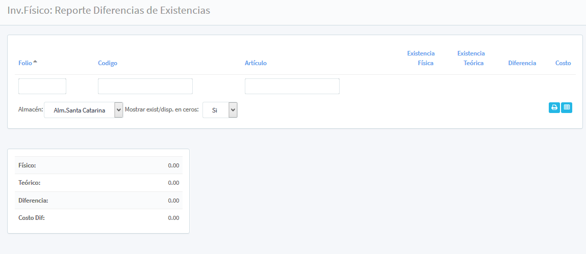 Se puede realizar el reporte de las diferencias físicas en el inventario con la siguiente información de búsqueda: Folio (asignado dentro del Almacén), Código (asignado al artículo),Artículo (descripción del articulo al que se desea consultar las diferencias), Existencia Física (existencia en almacén del artículo), Existencia Teórica (existencia registrada en sistema a diferencia de la existencia física), Diferencia (realiza un conteo de la diferencia de las dos anteriores) y Costo (diferencia de las existencias en datos monetarios).