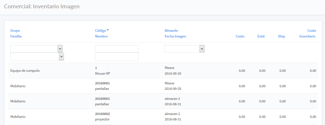 En este módulo se puede consultar la lista de productos del inventario con Imagen, enlistando la siguiente información: Grupo/Familia, Código/Nombre (código del producto o nombre del mismo), Almacén (ubicación donde se encuentra el producto) Fecha (en la que se agregó la imagen del producto), Costo, Existencia, Disponibilidad, Costo total e Inventario.