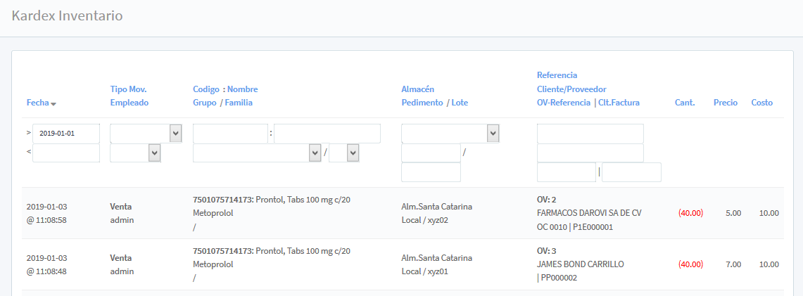 Para conocer la información, se realiza la búsqueda por medio de los filtros; Fecha (con dos campos de ingreso, indicando el periodo deseado), Tipo Mov. / Empleado (Seleccionando de la lista si es compra, venta, devolución, etc. y/o encargado del movimiento y registro en el Kardex), Código: Nombre / Grupo /Familia (asignado dentro de los grupos), Almacén/ Pedimento/ Lote (seleccionándolo de la lista), Referencia, Cliente/Proveedor, OV-Referencia, Clt.Factura (indicando dicha información en los cuadros en blanco de ingreso) y al final Cantidad, Precio y Costo.