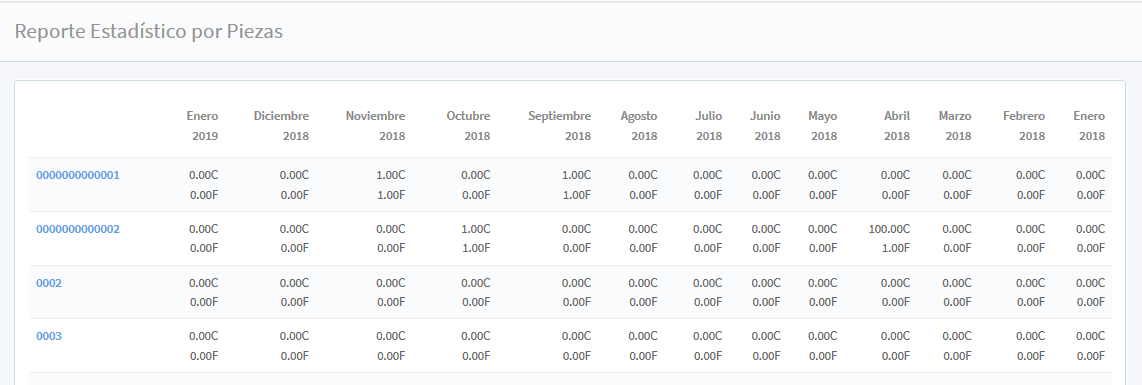 Contrario al anterior modulo, en esta sección aparecerá un reporte total mostrando estadísticas mensuales sobre las piezas o productos que se tengan dentro del inventario a manera de lista, es decir mostrara en un menú horizontal en la primera columna: