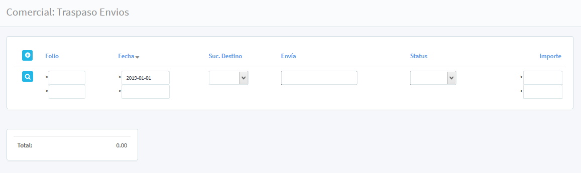 En la pantalla principal nos permite la búsqueda de la información por medio de los filtros; Folio (con dos campos de ingreso para un lapso de folios ingresados), Fecha (con dos campos de ingreso para seleccionar del calendario el periodo de folios a consultar), Sucursal Destino, Envía (seleccionar del cuadro de lista, la persona encargada del movimiento) Status (Cotización, Aprobado, cancelado y Recibido, según el estatus del traspaso) y por último el importe (con dos cantidades de ingreso).