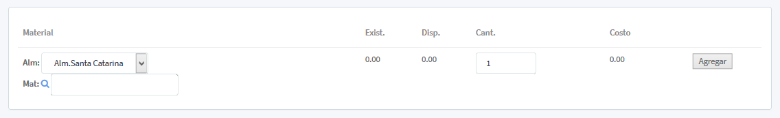 En la segunda parte de la pantalla se puede editar y/o agregar más material en el traspaso del envío, con los filtros: Almacén (seleccionando del cuadro de lista), MaterialExist. Disp. Cant. y Costo, al final el botón de agregar a la lista.
