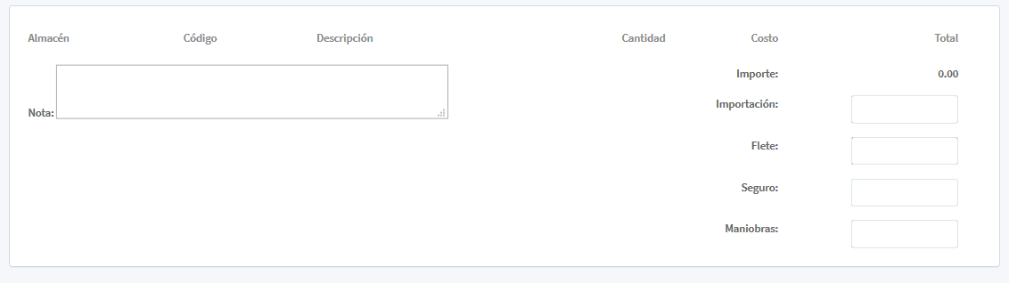 En la tercer parte de la pantalla se muestra; Almacén, Código, Descripción, Cantidad, Costo y total dando la lista de todos los artículos agregados anteriormente. Al final se realiza una suma del importe total, Importación, Flete, Seguro y Maniobras.