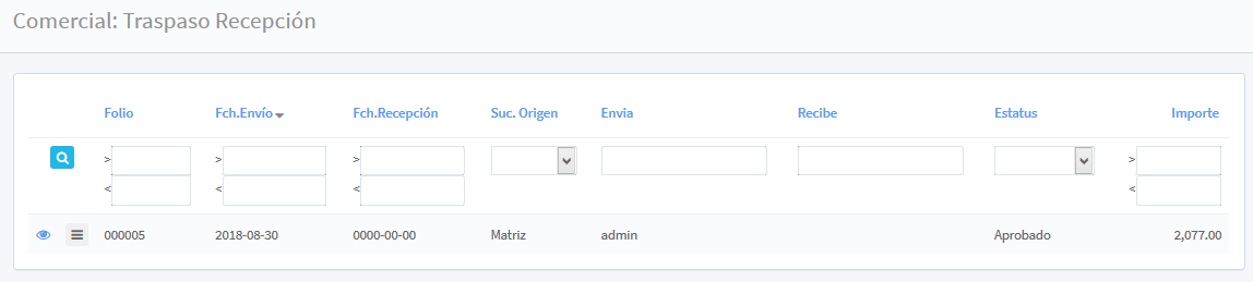 Caso contrario al módulo anterior se realiza la recepción de mercancía en este módulo como traspaso, en la pantalla se enlista la información de traspasos recibidos con los siguientes filtros de búsqueda; Folio (con dos campos de ingreso para el periodo de folios a buscar), Fecha Envío (con dos campos de ingreso para indicar el periodo de inicio y fin de búsqueda), Fecha Recepción (con dos campos de ingreso para indicar el periodo de búsqueda), Sucursal Origen (seleccionando el origen de la mercancía), Envía (área de salida de la mercancía), Recibe (persona que recibe el movimiento), Estatus (cotización, aprobado, cancelado y Recibido) e Importe (importe total de la mercancía recibida).