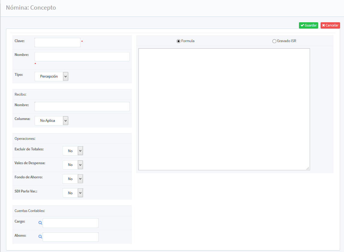 que nos enviara a la nueva pantalla donde se configura la información incluida en la nómina, los datos a ingresar son; Clave, Nombre, Tipo (percepción, deducción, obligación, descuento y gasto), Recibo, Nombre, Columna, Operaciones; Excluir totales, Vales de Despensa,, Fondo de ahorro, SDI Parte Var. (Habilitando las opciones necesarias en el cuadro de lista), y Cuentas contables de Cargo y Abono (seleccionando con el icono de búsqueda los activos y las cuentas correspondientes).