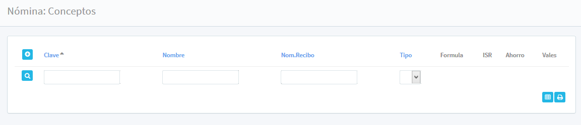 En la pantalla principal se consulta la información con los siguientes filtros: Clave, Nombre, Nom. Recibo, Tipo, Formula e ISR, Ahorro y Vales