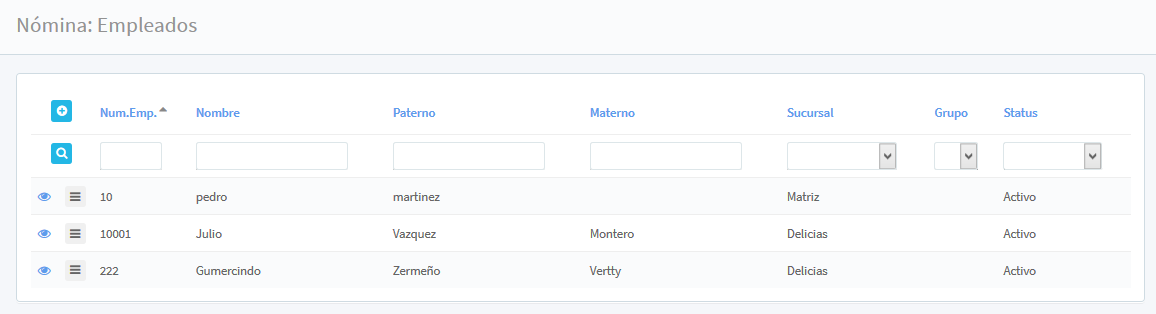En la pantalla principal se puede realizar la búsqueda y consulta por medio de los filtros: Núm. Empleado, Nombre (del empleado), Paterno, Materno, Sucursal (seleccionando de la lista la sucursal donde se encuentra el empleado), Grupo (si el empleado está asignado a un grupo y/o área seleccionando del cuadro de lista), Status (status actual del empleado dentro de la empresa).