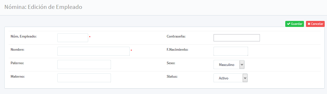 En la nueva pantalla es necesario llenar los siguientes campos: Número de Empleado, Nombre, Paterno y Materno (respectivamente), Contraseña (asignada al empleado), F. Nacimiento, Sexo y Status (status actual del empleado dentro de la empresa).