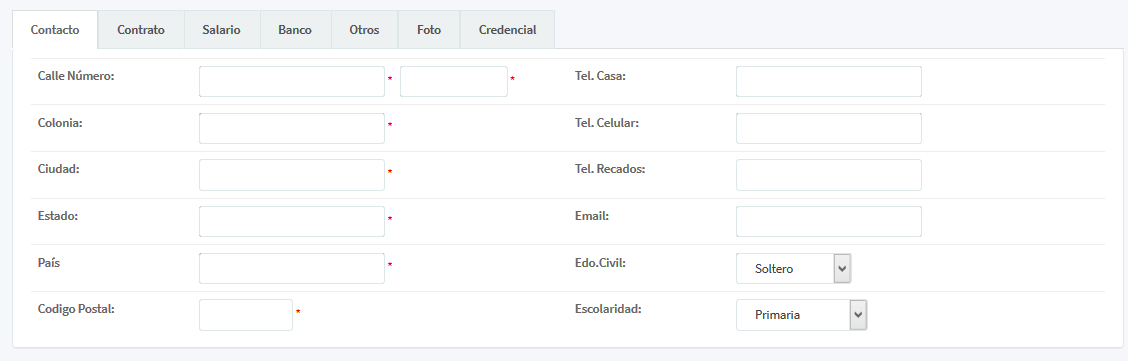 Tel. celular, Tel. casa y Tel. Recados (como opciones de contacto de teléfono fijo), Email (correo electrónico donde se pueda enviar información), Edo Civil y Escolaridad (dentro del cuadro de lista se agrega la escolaridad presentada por el empleado.