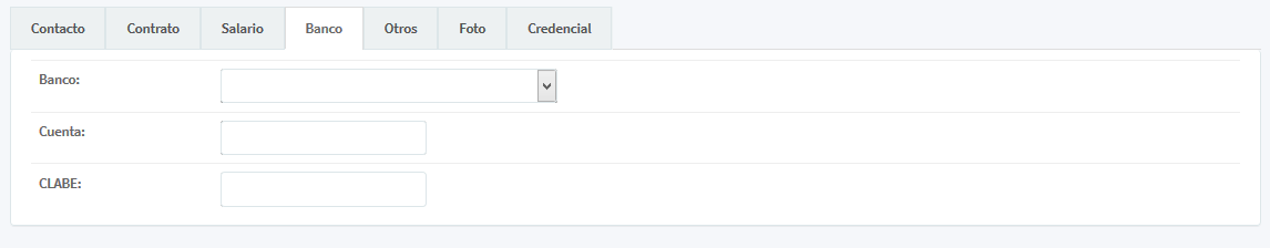 4. Banco: Para efectos de nómina se debe especificar el banco en el que se harán todos los movimientos bancarios del empleado; Banco, Cuenta, CLABE.