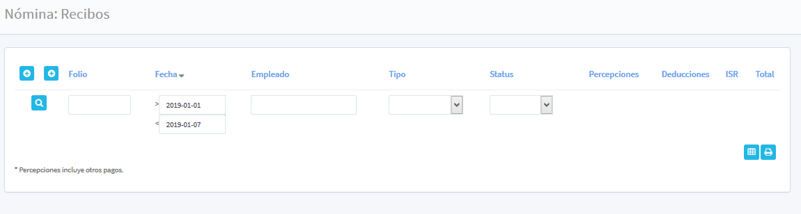 El menú de información que se puede consultar y generar es con el menú: Folio (asignado al pago), Fecha (del movimiento de pago de nómina), Empleado (nombre del empleado donde se realizara el movimiento), Tipo(tipo de movimiento en el recibo; normal, comisión, aguinaldo, finiquito y/o liquidación), Status (pendiente, aplicado y cancelado), Percepciones, Deducciones, ISR y Total.