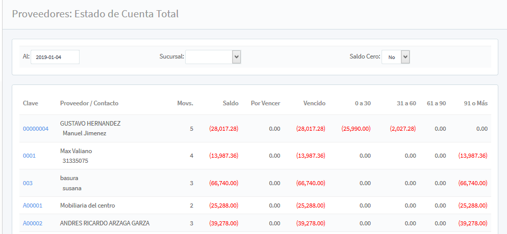 Al realizar la búsqueda nos mostrara con el siguiente menú de despliegue de manera horizontal, los datos: Clave, Proveedor/Contacto, Movs., Saldo, Por vencer, Vencido y periodo desde 0 a 91 días o más, de la siguiente manera: