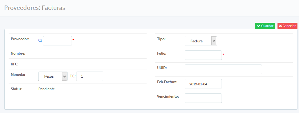 Guardar y Cancelar que permitirá guardar o cancelar la información capturada y a la vez regresar a la pantalla inicial de Proveedores: Facturas.