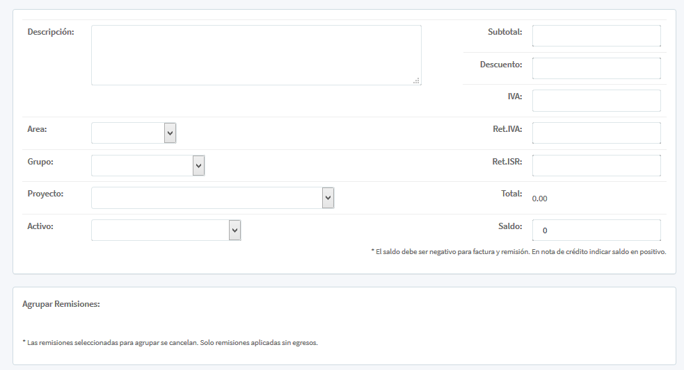 En la parte inferior de la misma pantalla aparece la opción de Descripción con un recuadro de texto libre para anotaciones o descripción que nos ayude a tener mayor información de la factura, Área, Grupo (con un recuadro de lista de despliegue para seleccionar el tipo de grupo de la realización de la factura), Proyecto y Activo.